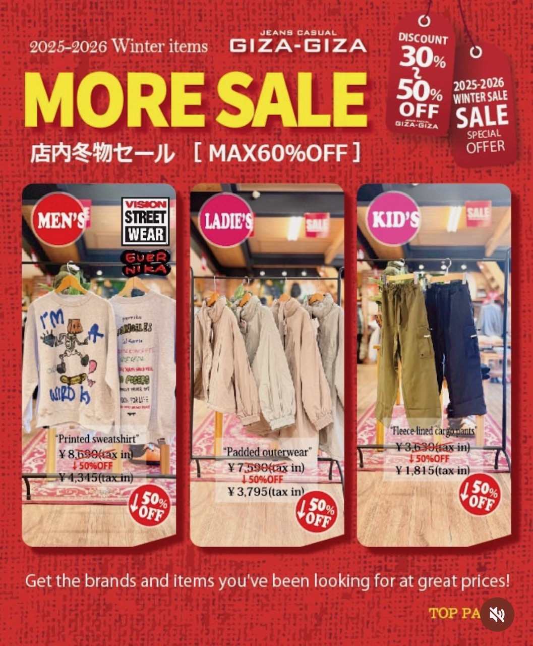 初雪も降り、本格的な冬到来ですね!!! 暖かいアイテム、たくさん入荷しています。 お得なアイテムご用意しました。 しっか…